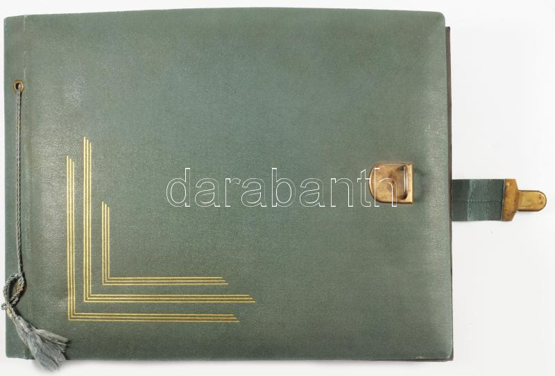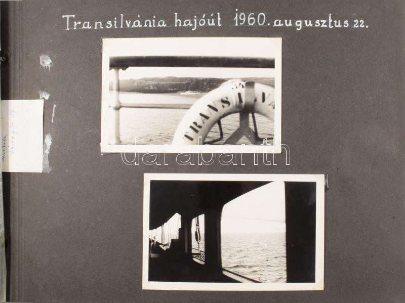 1960 ,,Transilvánia hajóút 1960. augusztus 22." fényképalbum romániai, ukrajnai, törökországi, egyiptomi, olaszországi fotókkal, képeslapokkal, prospektusokkal (összesen több mint 200 db), zsinórfűzéses, kapcsos, vászonborítású albumban, 25,5x34,5x6,5 cm