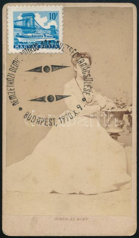 Beschreibung: cca 1865 Női portré Gondy és Egey kassai műterméből, rajta a Nemzetközi Demokratikus Nőszövetség pecsétjével, bélyeggel, 10,5×6,5 cm