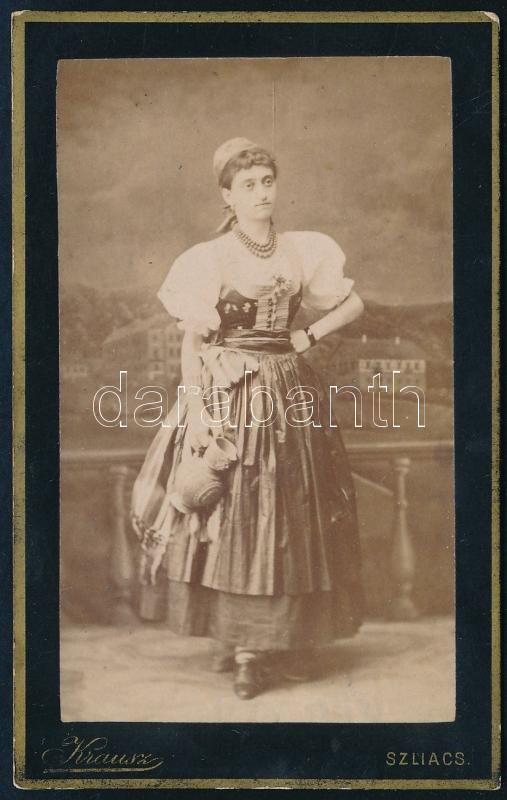 Beschreibung: cca 1883 Nő népviseletben, keményhátú fotó Krausz Tivadar szliácsi műerméből, 10,5×6,5 cm