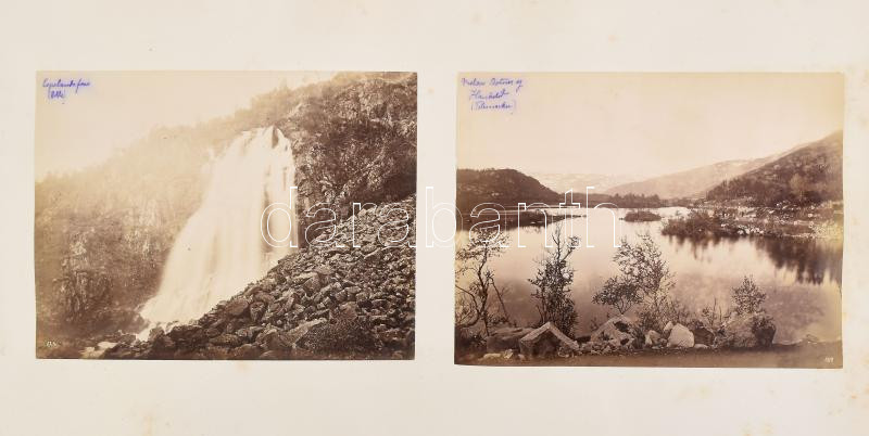 cca 1890-1900 Skandináv látképek és életképek a XIX. század végéről, 3 db fotó: Espelandfoss (Odda), táj Botnen és Haukedalen között (Telemark), norvég templom Telemark megyében, fotók kartonon, foltos kartonnal, feliratozva, az egyik fotó sarkán kis hiánnyal, 14x18 cmx3
