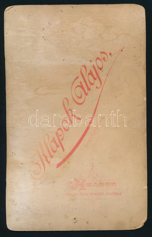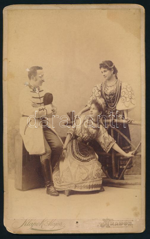 Beschreibung: cca 1900 Román népviseletes hölgyek és férfi portréja, kabinetfotó Klapok Alajos aradi műterméből, kissé sérült, foltos, deformált, 21x13 cm