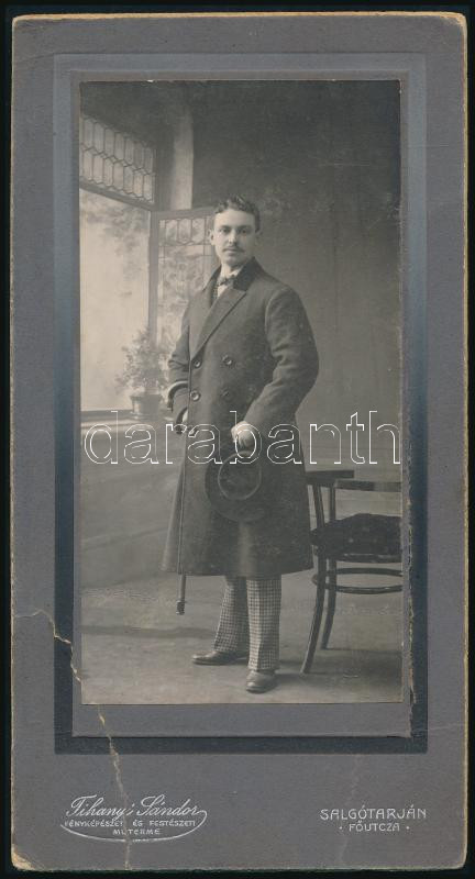 Beschreibung: cca 1910 Férfiportré, keményhátú fotó Tihanyi Sándor salgótarjáni műterméből, karton sérült, 20,5×11 cm