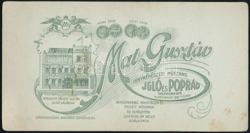 Beschreibung: cca 1910 Női portré, promenade keményhátú fotó Matz Gusztáv (Igló és Poprád) műterméből, hátoldalon a műterem képével, kopásnyomokkal, 20,5×11 cm