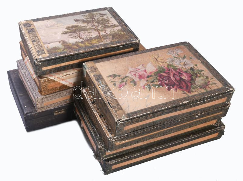 Beschreibung: 8 darab antik osztrák szivaros fadoboz, zömmel Tabak-Regie, h: 26 cm