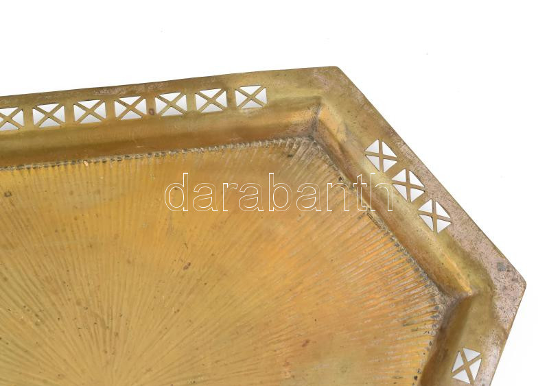 Beschreibung: Szecessziós ezüstözött alpakka teaszervírozó szett: tálca, kiöntő, cukortartó. Jelzett, kopással. Csomózott, kötegelt és növényi mintákkal díszítve, csont szigetelőgyűrűkkel.