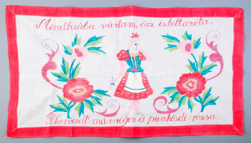 Beschreibung: Kézzel hímzett gyermek falvédő, "Mindhiába vártam, ősz is lett azóta, Elhervadt már régen a pünkösdi rózsa" felirattal, 44x78 cm