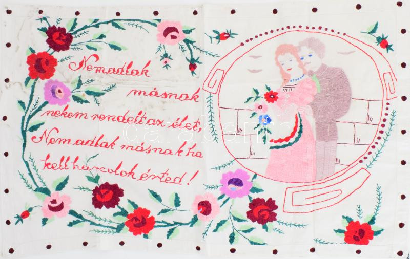 Beschreibung: Kézzel hímzett konyhai falvédő, "Nem adlak másnak, nekem rendelt az élet, nem adlak másnak, ha kell, harcolok érted!" felirattal, 46x73 cm