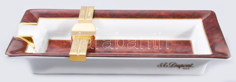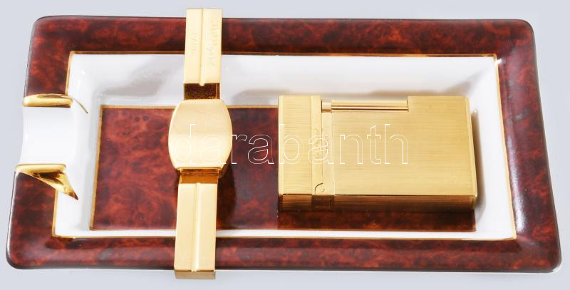 Beschreibung: St, Dupont aranyozott öngyújtó, szálcsiszolt felülettel, jelzett, sorszámozott 65x32mm. Hozzá Limoges St. Dupont szivar hamutartó, jelzett, hibátlan 16,5x10 cm
