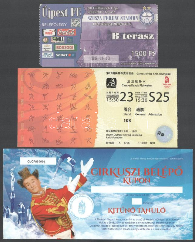 Beschreibung: 3 db belépőjegy: Pekingi olimpia, Újpest FC futballmérkőzés, Fővárosi Nagycirkusz cirkuszi belépő kitűnő tanuló részére