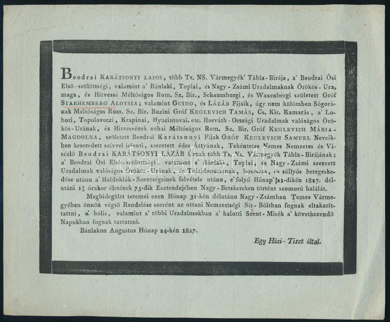 Beschreibung: 1827 Bánlak, beodrai Karátsonyi Lázár vármegyei táblabíró halotti értesítője, 19,5x24 cm