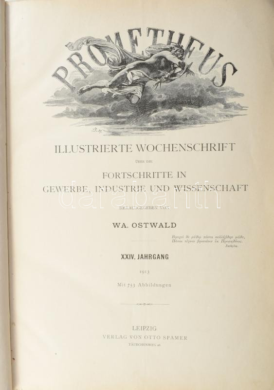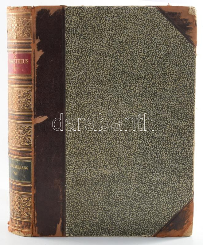 1913 Prometheus. Illustrierte Wochenschrift über die Fortschritte in Gewerbe, Industrie und Wissenschaft. XXIV. Jahrgang. Német nyelvű folyóirat teljes évfolyama, egybekötve. Aranyozott gerincű félbőr-kötésben, sérült borítóval és gerinccel, sérült szennylapokkal.