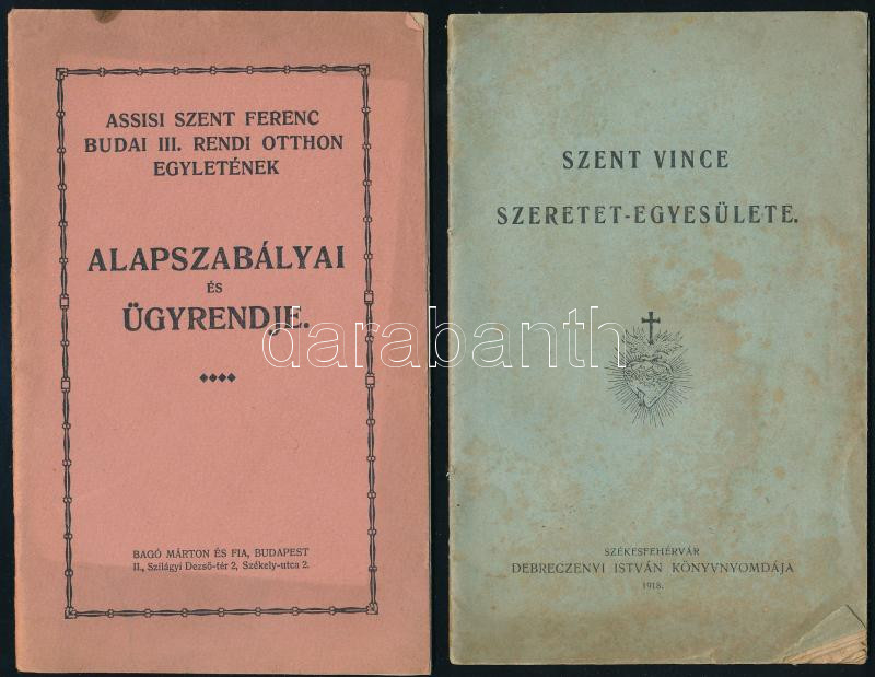 1914 Assisi Szent Ferenc Budai III. Rendi Otthon Egyletének alapszabályai és ügyrendje, 21+(3) p. + 1918 Szent Vince Szeretet-Egyesületének alapszabályai és ügyrendje, 30+(2) p. Kiadói tűzött papÃrkötés, az egyik foltos.