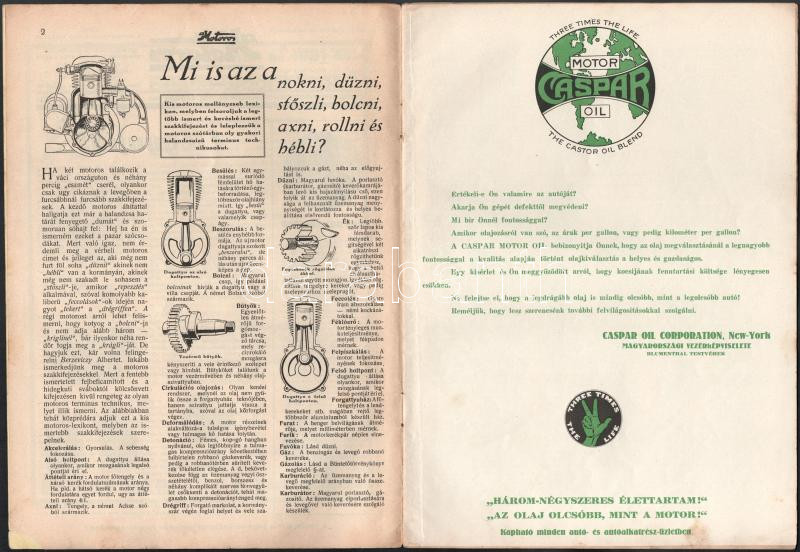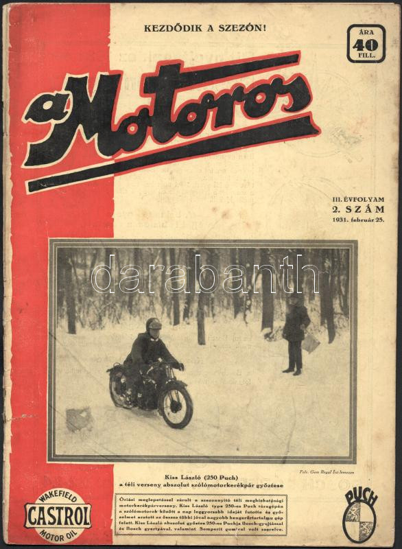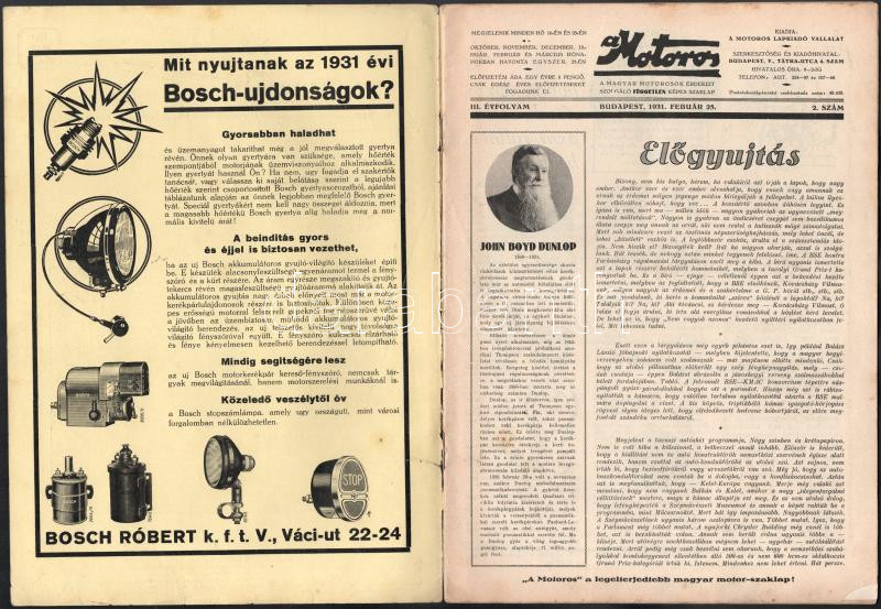 1931 A Motoros. A Magyar Motorosok Érdekeit Szolgáló Független Képes Szaklap. 1931. feb. 25. III. évf. 2. sz. Bp., 1931, Motoros Lapkiadó Vállalat, (Egyesült-ny.), 20 p.+1 t. Gazdag és izgalmas fekete-fehér képanyaggal illusztrált. Érdekes korabeli hírekkel, és írásokkal. Kiadói papírkötésben, a füzet elvált a borítótól, a borító szakadt.