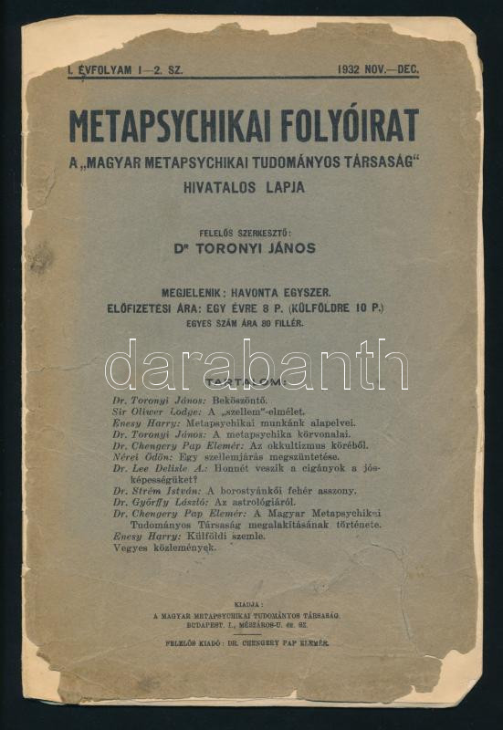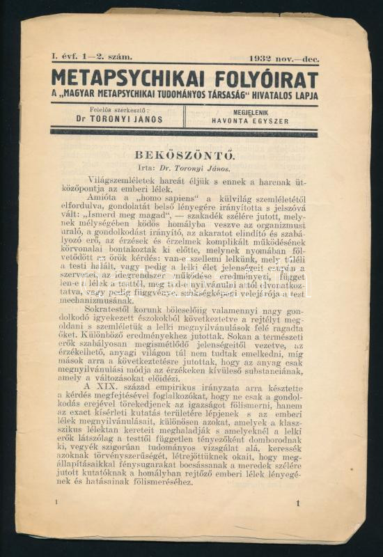 1932 Metapsychikai Folyóirat. A "Magyar Metapsychikai Tudományos Társaság" hivatalos lapja I. évf. 1-2. sz. 1932 nov. - dec. Teljes évfolyam. Szerk: Toronyi János. Bp., 1932, Magyar Metapsychikai Tudományos Társaság,(Pallas-ny.), a borítója sérült, leszakadt, 31+1 p.