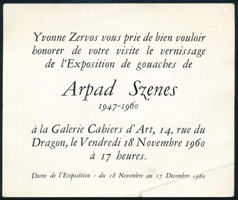 Beschreibung: 1960 Szenes Árpád (1897-1985) Párizsban élő festőművész kiállítására szóló meghívó, a Galerie Cahiers d'Art-ba, jobb alsó sarkában töréssel