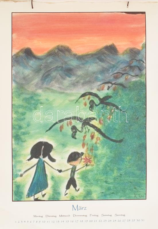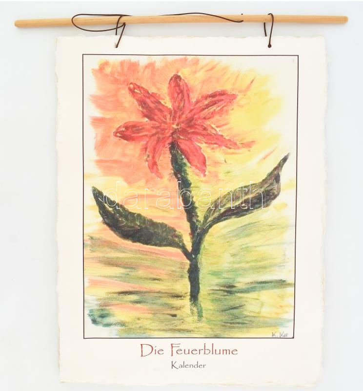 2013 Anna Mödlagl - Karin Keresztes-Heinze: Die Feuerblume. Kalender. Színes reprodukciókkal illusztrált, német nyelvű falinaptár, merített papíron. Készítette: Vincze László és Fiai Papírmerítő Műhely, Szentendre. 44x32 cm