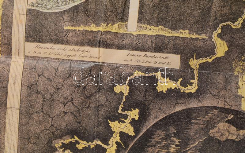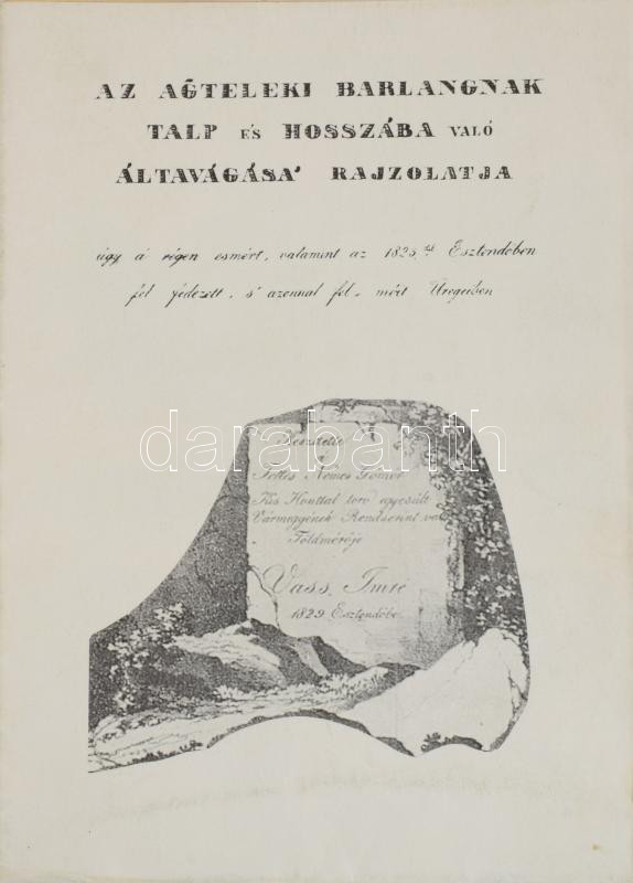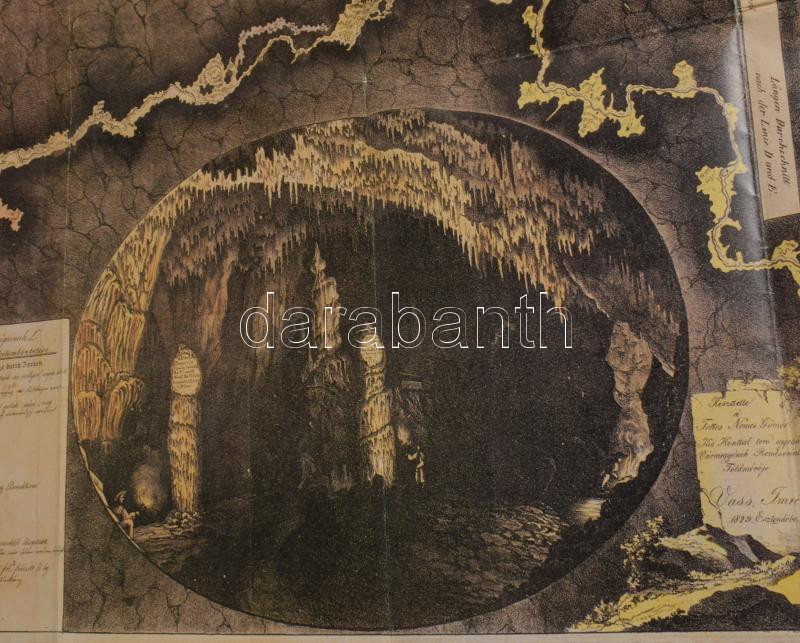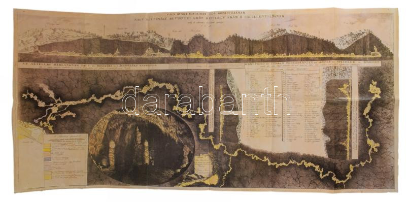 Az agteleki barlangnak talp és hosszába való általvágása' rajzolatja, Vass Imre (1795-1863) barlangkutató az aggteleki barlangról írt 1831-es művében megjelent illusztráció reprintje, hátoldalán német, angol és magyar nyelvű leírással, 49x98 cm