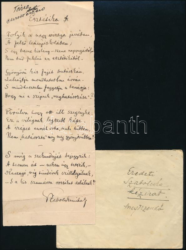 cca 1900 Szabolcska Mihály Esztétika című versének teljes, autográf ké... https://www.darabanth.com/de/514-Auktion-Philatelie-Postkarten-Numismatik-Kunstwerke-Bucher-Schreibwaren-Schmuck/515.0/Kunst-Dokumente-andere-Sammelgebiete/Drucksachen~83/cca-1900-Szabolcska-Mihaly-Esztetika-cimu-versenek-teljes-autograf-kezirata~II3480748