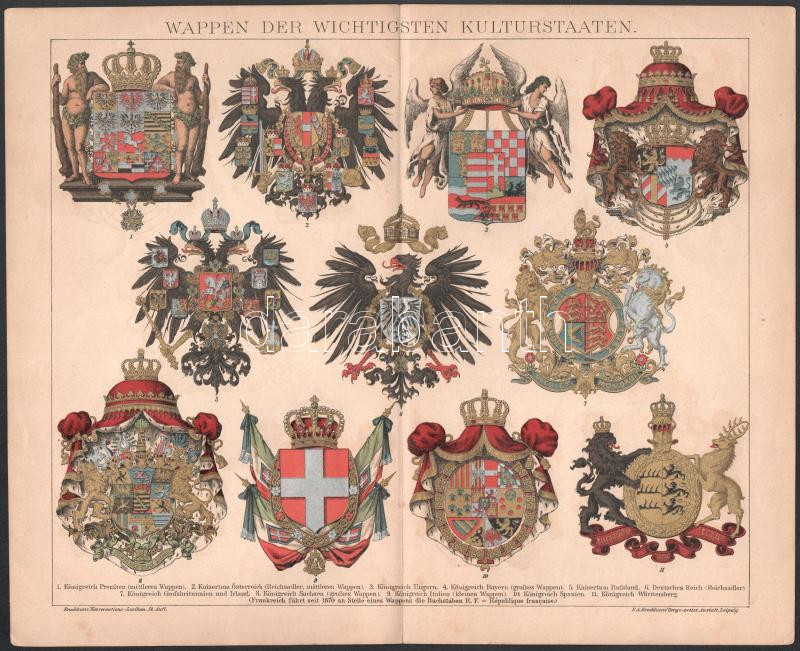 cca 1900 Wappen der wichtigsten Kulturstaaten / A legfontosabb kultúrállamok címerei, színes tábla a Brockhaus Konversations-Lexikon 14. kiadásából, 25x31 cm