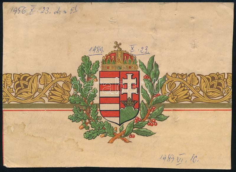 cca 1920 Litografált magyar címer 1956-os és 1989-es dátumokkal, amiko... https://www.darabanth.com/de/514-Auktion-Philatelie-Postkarten-Numismatik-Kunstwerke-Bucher-Schreibwaren-Schmuck/515.0/Kunst-Dokumente-andere-Sammelgebiete/Drucksachen~83/cca-1920-Litografalt-magyar-cimer-1956-os-es-1989-es-datumokkal-amikor-a-cimert-a-tortenelem~II3438053