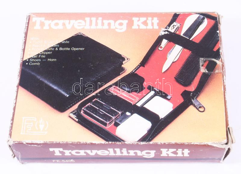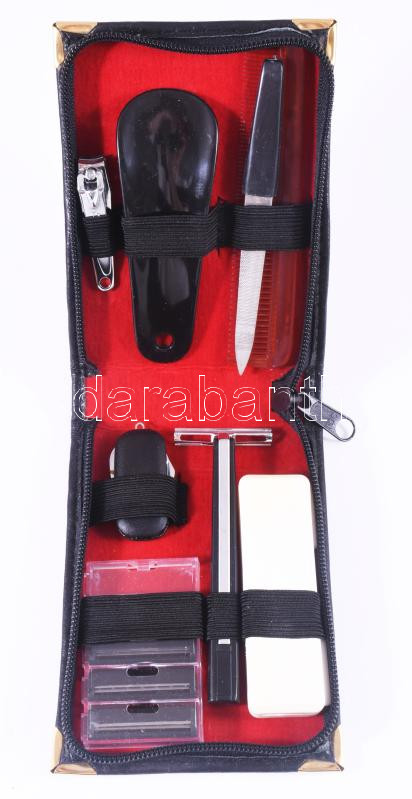 Beschreibung: Férfi neszeszer, benne borotva, utazó fogkefe, fésű, cipőkanál, stb., eredeti dobozában, újszerű