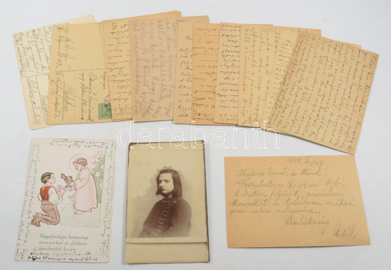 1936-1942 Pokorny Marcella (?-?) festművész, grafikus, művészeti író, rajztanár részére szóló 10 db levelezőlap és 1 db képeslap, valamint további 3 db Pokorny Ernő főszámtanácsos részére szóló lap. + 1924 Pokorny Marcella portréfotója, fotólap, a hátoldalán autográf bejegyzésével és aláírásával, dátumozva, 14x8 cm