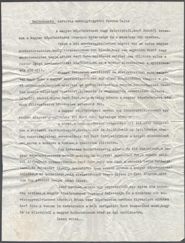 1939 novembere, Kecskeméti György (1901-1944) író, újságíró, a Pester Lloyd felelős szerkesztője gyászbeszéde Gerő Ödön (1863-1939) műkritikus, író temetésekor. Két géppel írt oldal, Kecskeméti György autográf aláírásával. Egy apró sérüléssel és egy kisebb szakadással. Gerő Ödön húsz éven keresztül a haláláig a Pester Lloyd művészeti rovatának vezetője, műkritikusa volt. A tételhez tartozik Szentgyörgyvári Gyenes Lajos (1890-1971), a Munkácsy-Céh főtitkárának gyászbeszéde, egy géppel írt oldal, apró foltokkal.