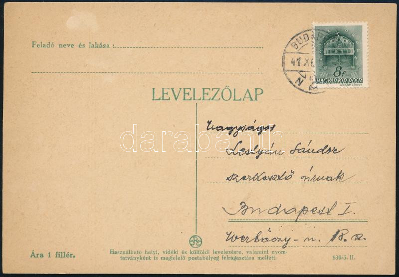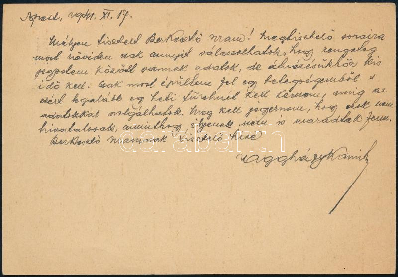 1941 Bp., Aggházy Kamil (Kamill) (1882-1954) m. kir. ezredes, katonai szakíró, hadtörténész, a Hadtörténeti Intézet és Múzeum alapítója saját kezűleg megírt levelezőlapja Lestyán Sándor (1896-1956) író, újságíró, szerkesztő részére