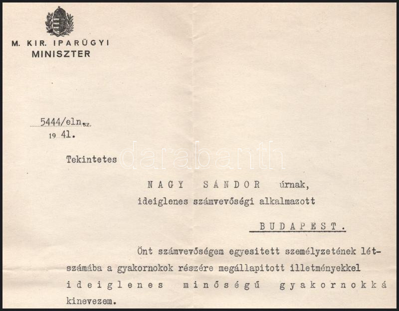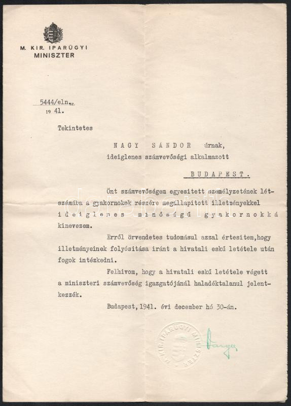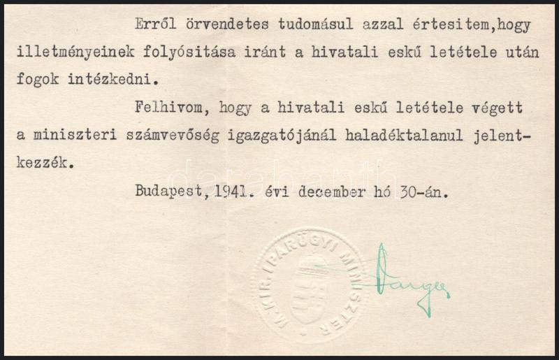 1941 Bp., Varga József (1891-1956) Corvin-koszorús és kétszeres Kossuth-díjas vegyészmérnök, gazdaságpolitikus, egyetemi tanár, az MTA tagja, iparügyi miniszter, illetve kereskedelem- és közlekedésügyi miniszter (1939-1943) autográf aláírása kinevezésen