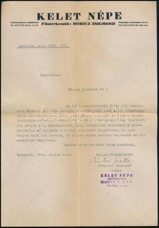 1942 Bp., Vámbéri Gusztáv történelemtanár, a Rákospalotai Múzeum első igazgatója, a Kelet Népe titkárának autográf aláírása az Exodus Irodalmi Rt.-nek címzett, gépelt levelén, a Kelet Népe folyóirat fejléces levélpapírján