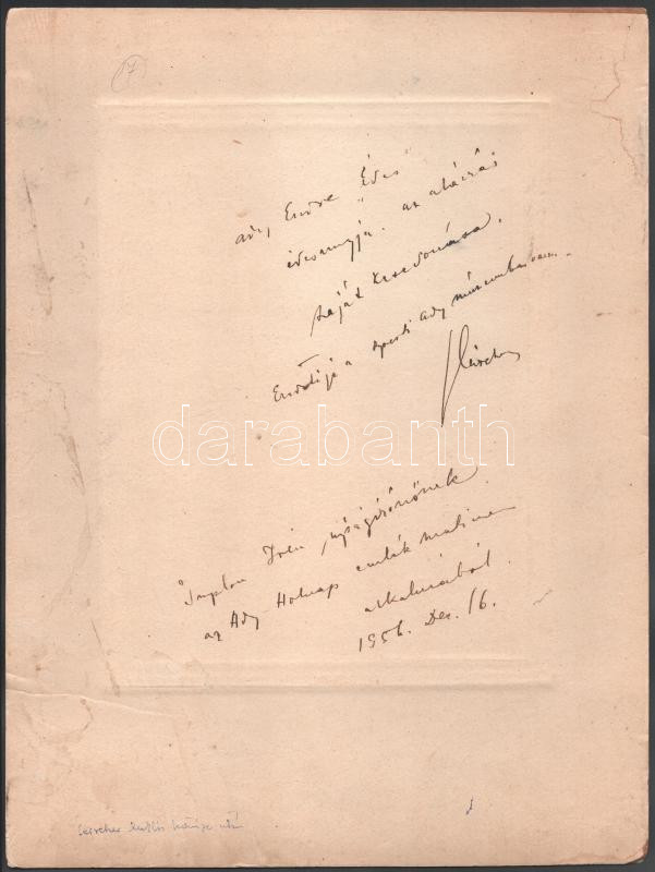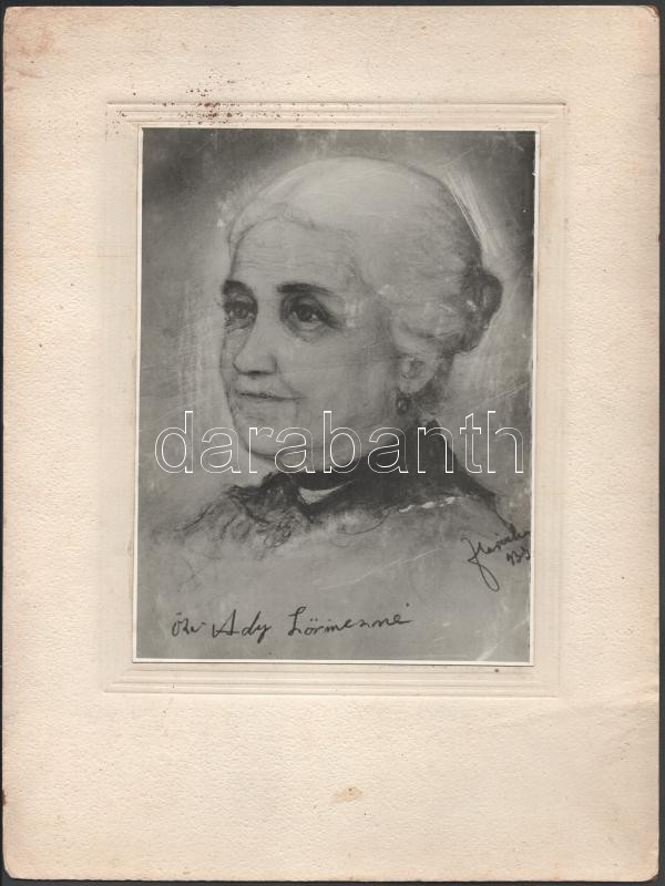 1956 Ady Endre édesanyja, özv. Ady LÅ‘rincné portréja, Fleischer Miklós festménye után készült, nagyméretű fotó kartonon, a hátoldalon Fleischer Miklós (1894-1958) festÅ‘művész autográf aláÃrásával és soraival Implon Irén (1927-2011) erdélyi magyar újságÃró, szerkesztÅ‘ részére, kissé foltos karton, 23,5x17,5 cm, karton: 38,5x29 cm