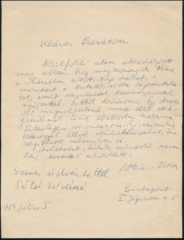 1964 Sőtér István (1913-1988) Kossuth-díjas író, irodalomtörténész, esszéista, az MTA tagja, az ELTE rektorának saját kezű levele, Sőtér István és felesége, Sőtér Istvánné Jász Veronika (1920-1989) grafikus, iparművész aláírásával