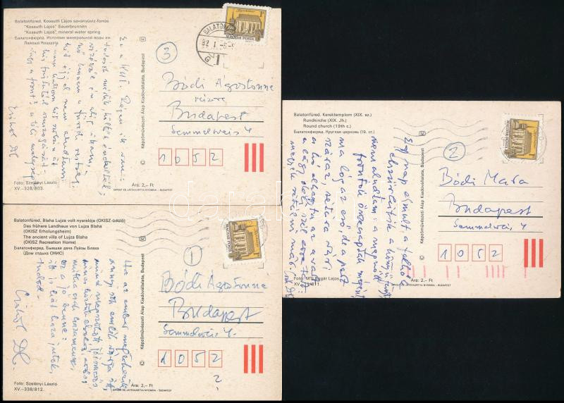 1982 januárja, Keresztury Dezső (1904-1996) költő, korábbi korábbi vallás- és közoktatásügyi miniszter autográf verses sorai Bódi Marának, 3 db Balatonfüredről küldött képeslapon, Keresztury Dezső autográf aláírásával.