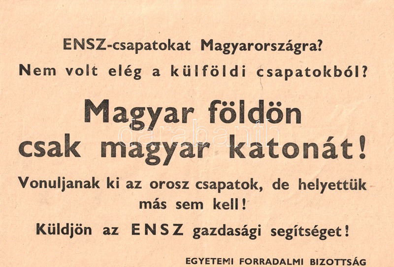 [Aprónyomtatvány, röplap, 1956.] ENSZ-csapatokat Magyarországra? Nem volt elég a külföldi csapatokból? Az Egyetemi Forradalmi Bizottság felhívása (1956).