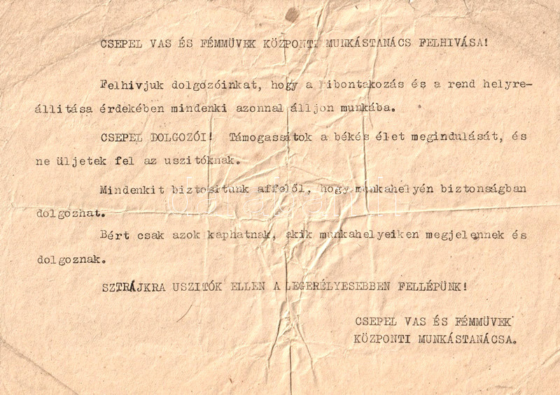 [Dokumentum, 1956.] A Csepel Vas és Fémművek Központi Munkástanácsa munkafelvételi felhívásának eredeti, sokszorosított, gépelt példánya. (1956).