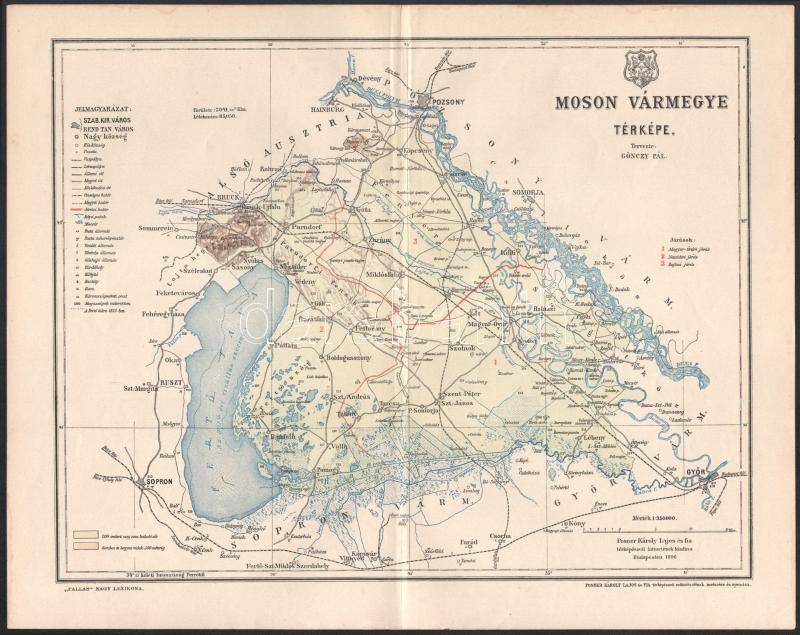 Beschreibung: 1896 Moson vármegye térképe, tervezte: Gönczy Pál, 1:350 000, kiadja: Posner Károly Lajos és Fia, Pallas Nagy Lexikona, 24×30 cm