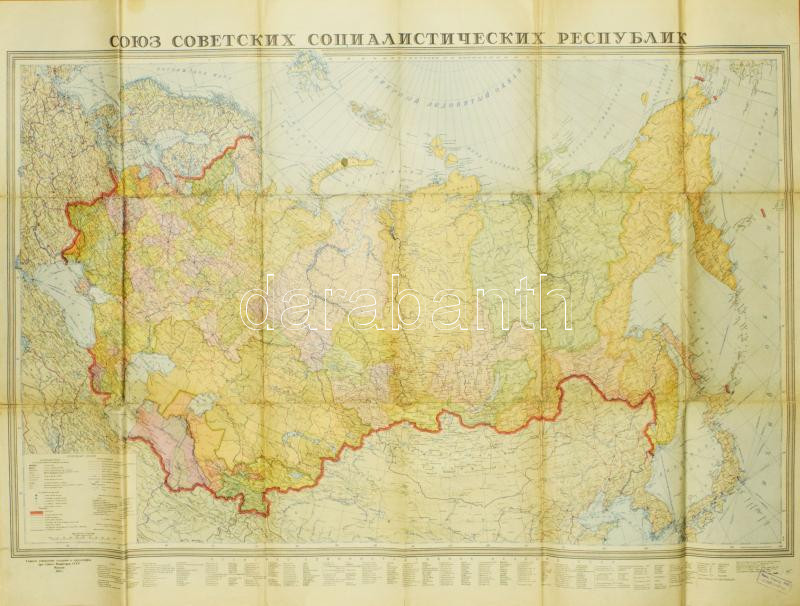 1951 A Szovjetunió térképe, nagyméretű térkép, kisebb sérülésekkel, 90... https://www.darabanth.com/de/514-Auktion-Philatelie-Postkarten-Numismatik-Kunstwerke-Bucher-Schreibwaren-Schmuck/515.0/Kunst-Dokumente-andere-Sammelgebiete/Landkarten~79/1951-A-Szovjetunio-terkepe-nagymeretu-terkep-kisebb-serulesekkel-90x123-cm~II3478230