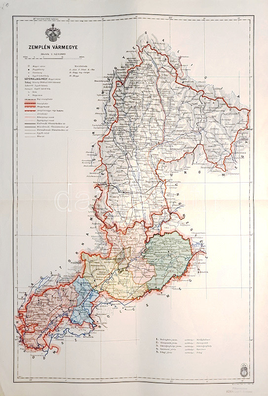 Domborzati és vízrajzi részleteket is feltüntető térképünk a M. kir. Honvéd Térképészeti Intézet 1937-1941 között készült közigazgatási térképsorozatának tagja, mely 1941. évi kiadási idejének megfelelően a jelentős határbővülések: az első bécsi döntés (1938 novembere) és kisebb részben a kárpátaljai bevonulás (1939 márciusa) nyomán megnagyobbodott északkeleti megyénket, Zemplén megyét ábrázolja. Megyetérképünk a színkódolt járásbeosztáson kívül feltünteti a megye egy- és kétvágányú vasútvonalait, első-, másod- és harmadrendű útjait és egyéb műútjait; településhálózatát: megyei városát (Sátoraljaújhely), nagyközségeit (Tokaj, Sárospatak, Királyhelmec, a szlovák oldalon Tőketerebes, Gálszécs, Nagymihály, Homonna), kisközségeit és egyéb lakott helyeit. A megye határvonalai értelemszerűen eltérnek a maiaktól, a sátoraljaújhelyi székhelyű, borászatáról nevezetes megye történelmi hagyományainak megfelelően semmilyen közigazgatási kapcsolatban nincs Miskolccal (Borsod) vagy Kassával (Abaúj). Hagyományos járásbeosztást csupán a megye trianoni, illetve az első bécsi döntéssel elnyert királyhelmeci területén találunk; a történelmi megye kárpátaljai bevonulással visszaszerzett északkeleti sarkának, a Ciróka folyó felső folyása menti területének járásbeosztása nincs feltüntetve, hiába tartozik Magyarországhoz: ez a terület ugyanis 1939 márciusa óta, miként Kárpátalja egésze, katonai közigazgatás alatt állt. A kibővült megye közlekedési ütőere továbbra is a hegyaljai vasút, a (Miskolc)-Szerencs-Sárospatak-Sátoraljaújhely-vasútvonal, mely Sátoraljaújhely után a visszanyert területek révén még bő 20 kilométeren át magyar területen halad. A megye további hegy- és síkvidéki vasútvonalai viszont csupán egyvágányú szárnyvonalak. Döntően közigazgatási és közlekedésföldrajzi célokat szolgáló térképünk vízrajzi és domborzati részleteket is tartalmaz, egyes hegycsúcsok magassági adatával. A megye várromjait piktogramok jelölik. Egyes települések mellett magassági jelzés.