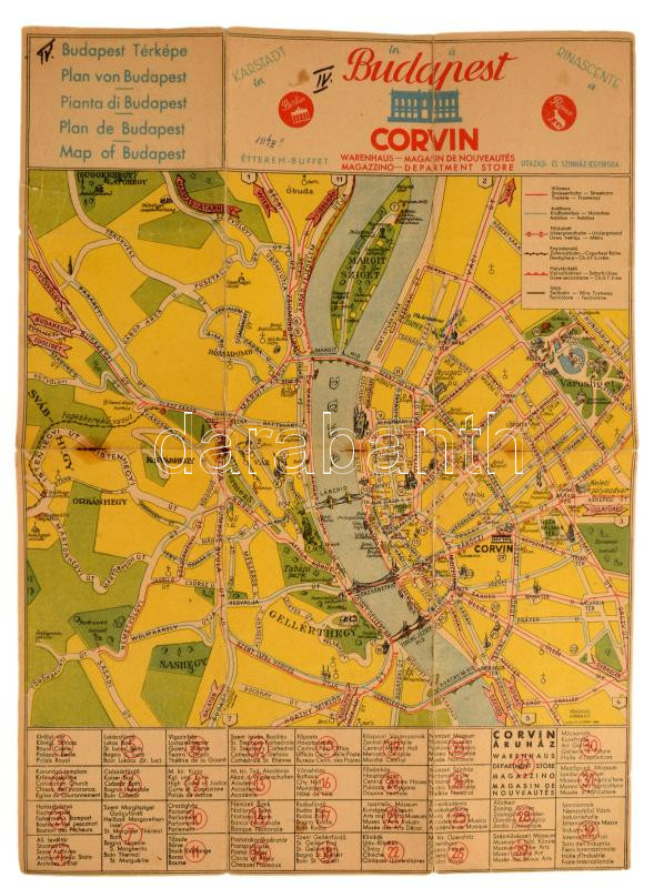 cca 1942 Budapest térképe / Magyarország úthálózatának térképe (rajta a visszacsatolt Észak-Erdéllyel és Délvidékkel), a Corvin Áruház reklámkiadványa, sérülésekkel, ragasztott, 42x31 cm