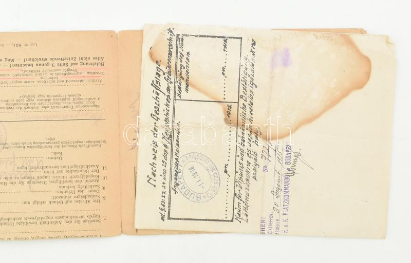 1915-1918 Michailovits György huszár főhadnagy, a cs. és kir. 10. huszárezred tagja részére kiállított szabadságigazolvány és menetlevél, bélyegzésekkel, foltos, sérült állapotban