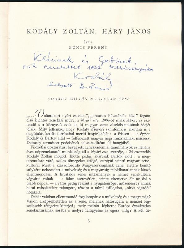 Beschreibung: 1962 Kodály Zoltán: Háry János. Magyar Állami Operaház. Bónis Ferenc által Devecseri Gábornak DEDIKÁLT!