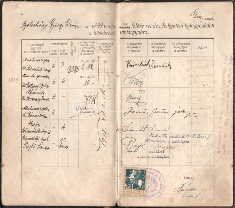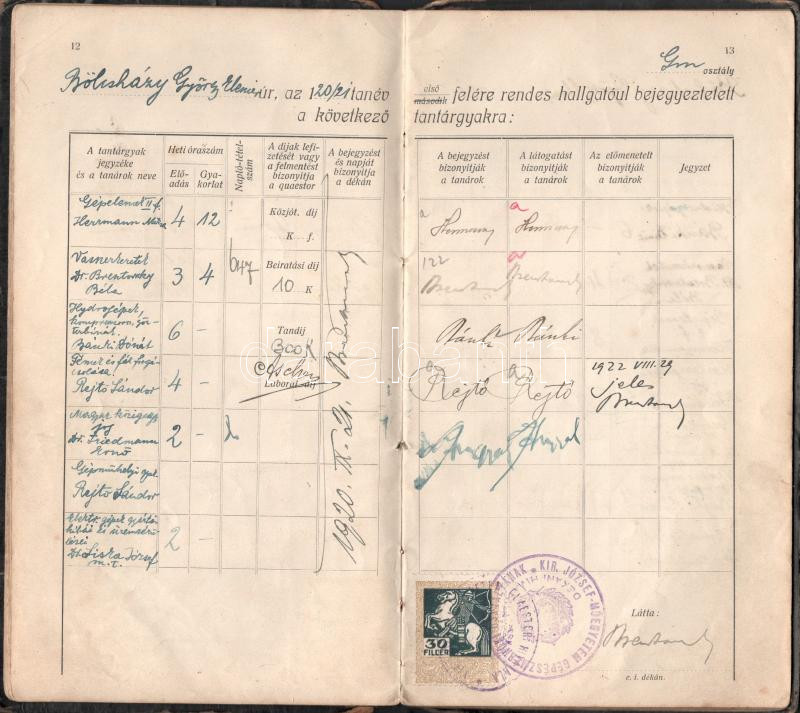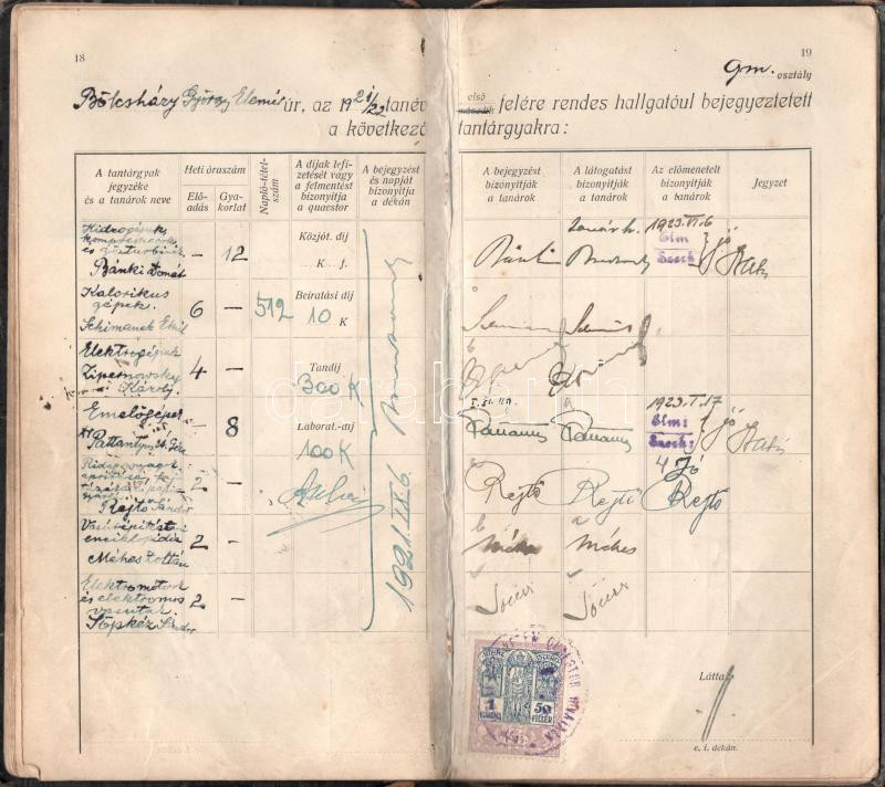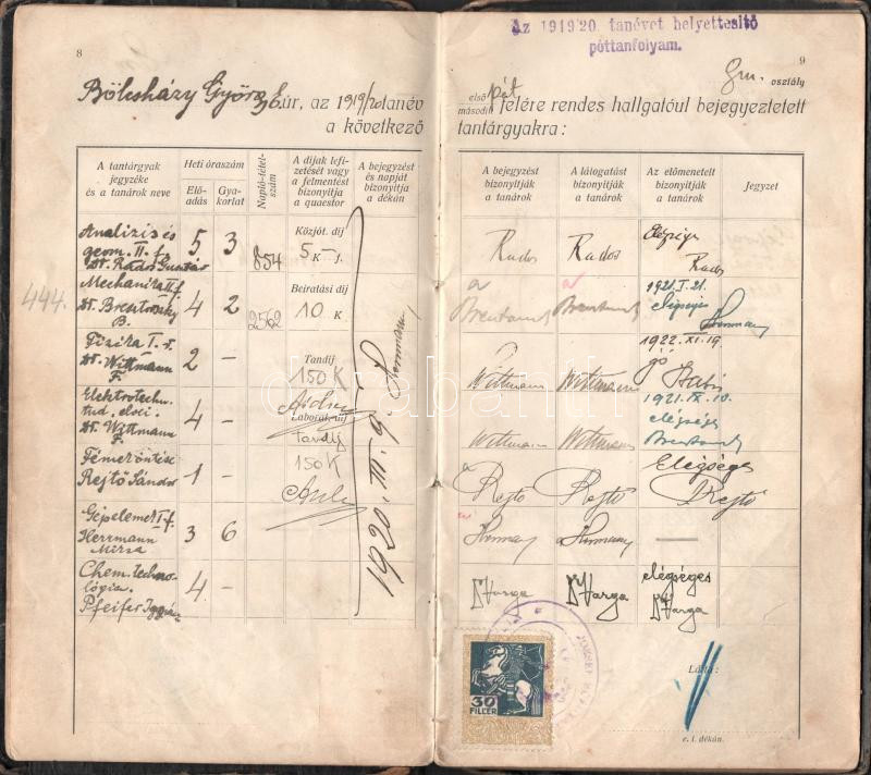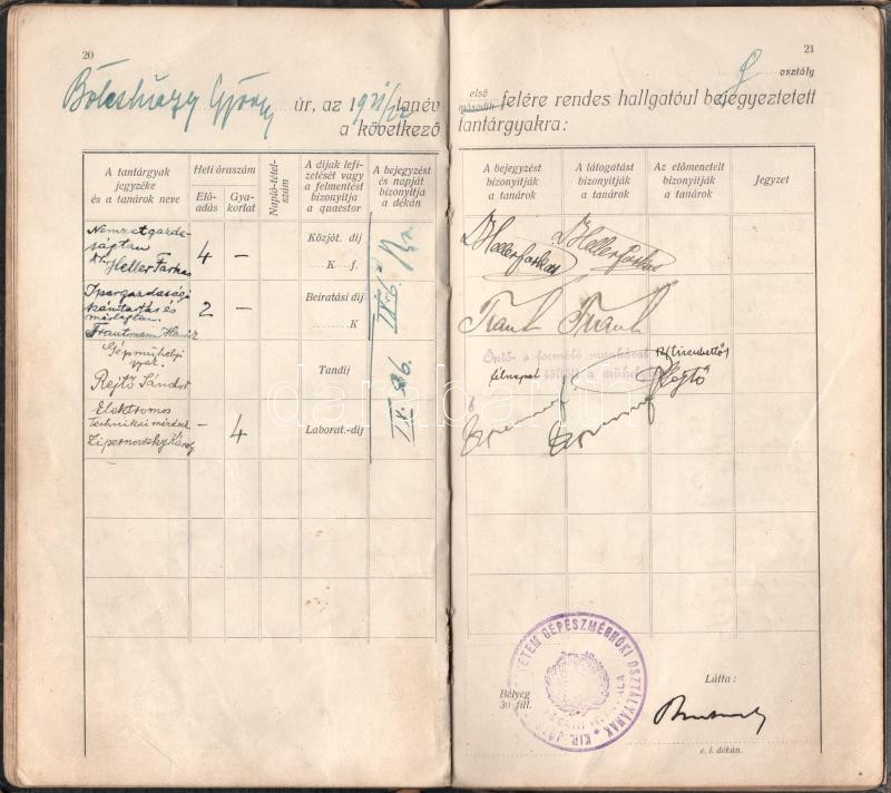 Beschreibung: 1918 Műegyetemi leckekönyv Bánki Donát, Zipernovzsky Károly és mások aláírásával