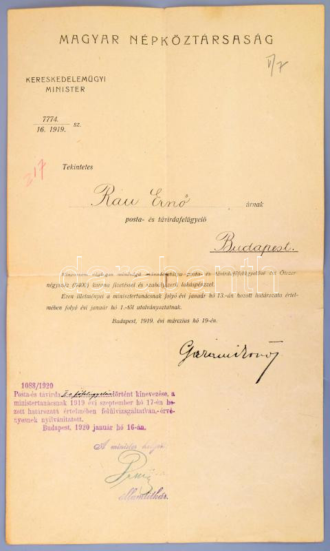 Beschreibung: 1919 Garami Ernő (1876-1935) szociáldemokrata politikus, kereskedelemügyi miniszter bélyegzett aláírása kinevezésen
