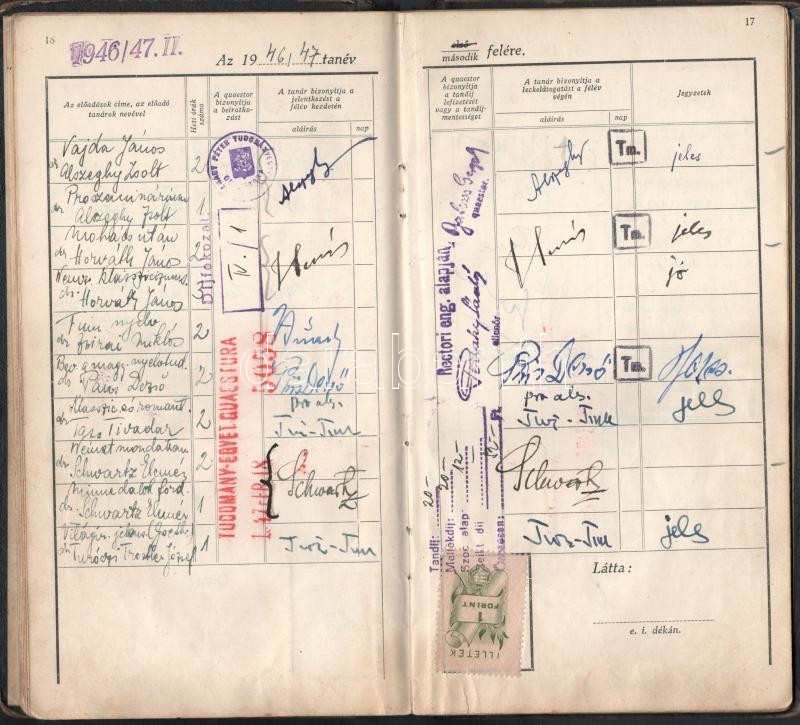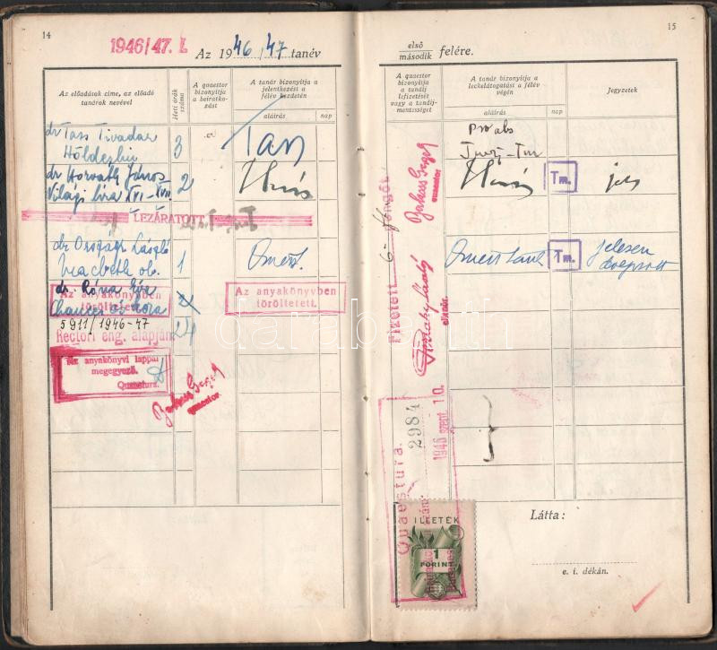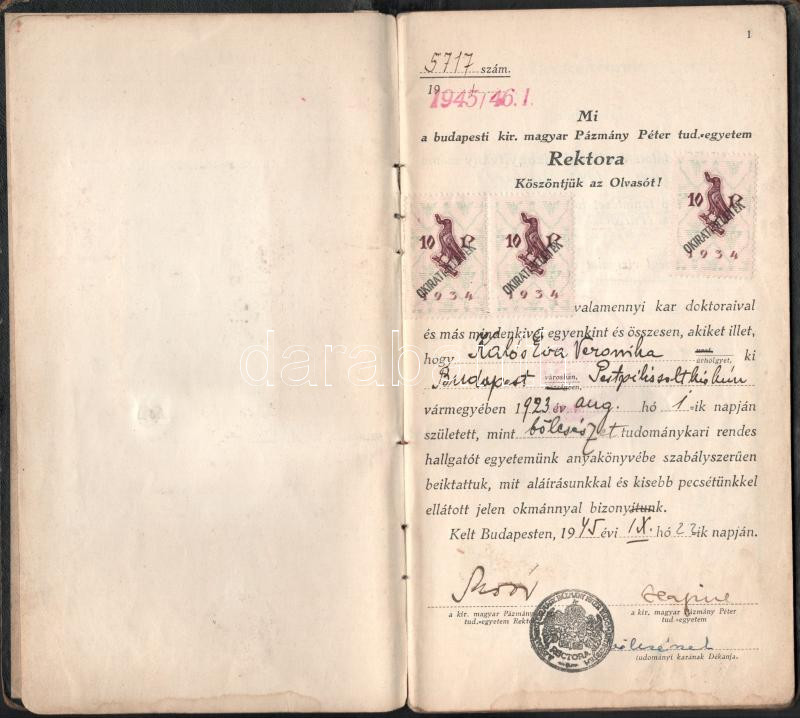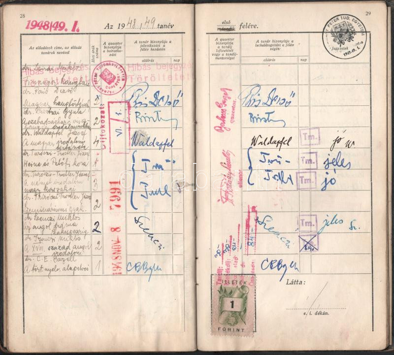 Beschreibung: 1945 Egyetemi leckekönyv Hajnal, Moór, Pais és mások aláírásával