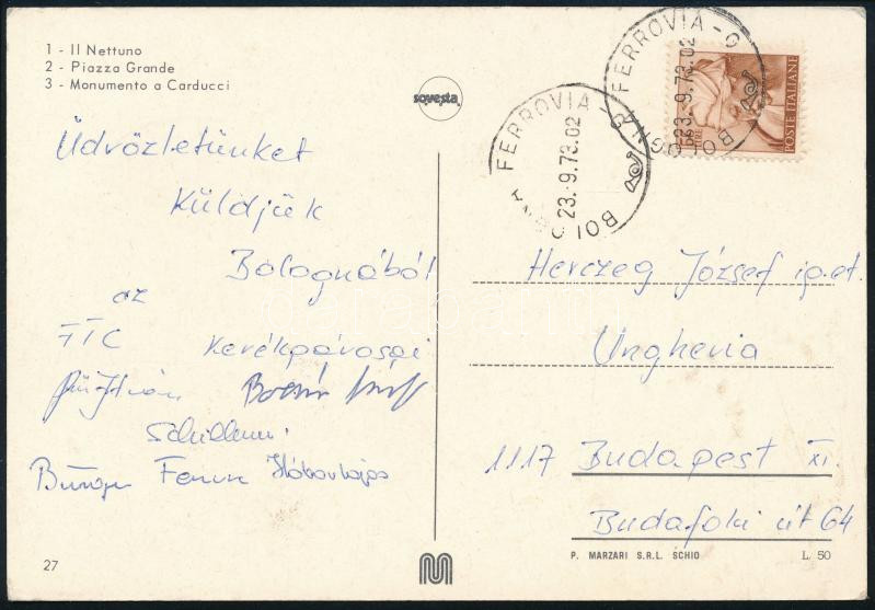 Beschreibung: 1973 Bologna, az FTC kerékpárosai által aláírt képeslap: Bürger Ferenc, Hóbor Lajos és mások (összesen 5 db aláírás)