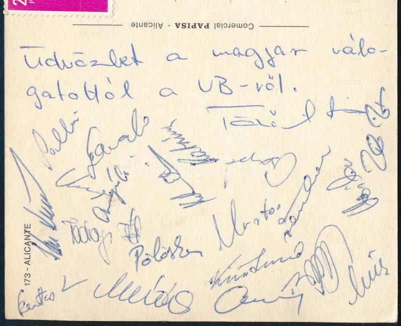 1982 "Üdvözlet a magyar válogatottól a VB-ről." Spanyolország labdarúgó Világbajnokság, a magyar válogatott játékosai által aláírt képeslap, többek közt Törőcsik András, Sallai Sándor, Garaba Imre, Csapó Károly, Pölöskei Gábor, Szentes Lázár autográf aláírásaival.