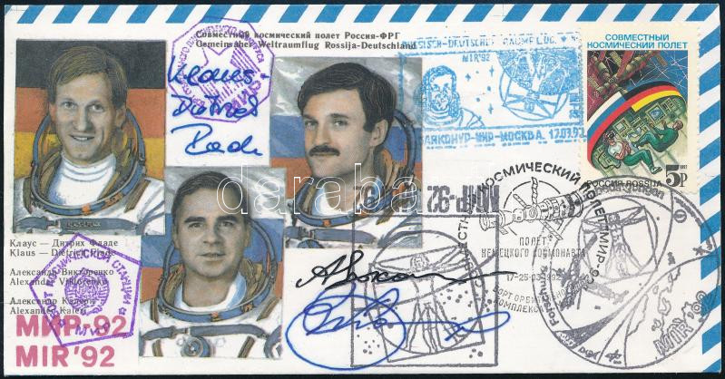 Beschreibung: Alekszandr Viktorenko (1947- ), Alekszandr Kaleri (1956- ) szovjet és Klaus-Dietrich Flade (1952- ) német űrhajósok aláírásai emlékborítékon /