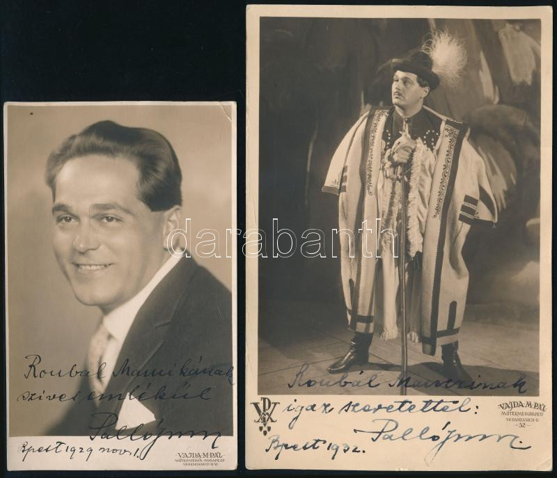 Beschreibung: Palló Imre (1891-1978) Kossuth-díjas operaénekes (bariton) 2 db saját kezűleg dedikált fotója, 14x8,5 cm és 17,5x11,5 cm