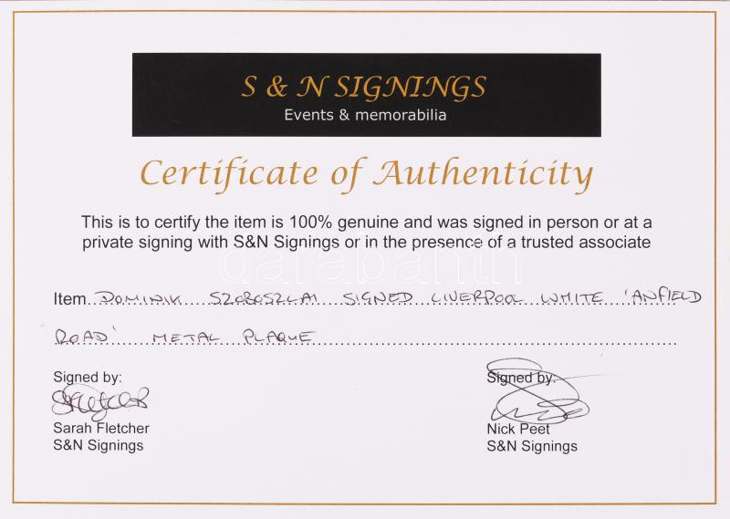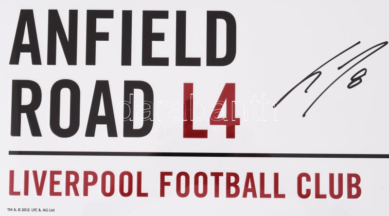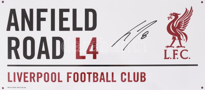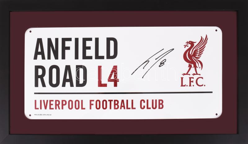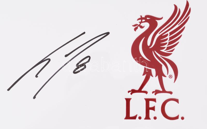 Beschreibung: Szoboszlai Dominik labdarúgó autográf aláírásával ellátott Liverpool FC fém tábla, bekeretezve, certifikáttal. Keret mérete 50x28 cm