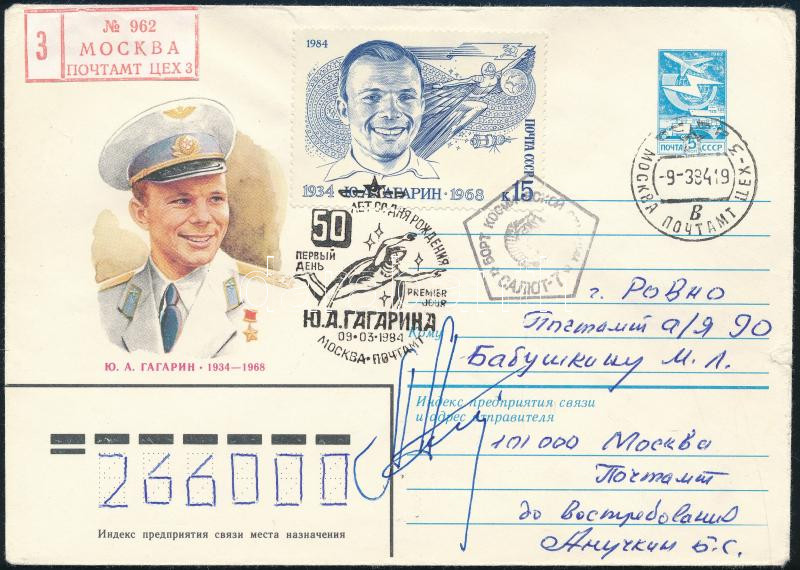 Beschreibung: Szojuz TM 9 Alekszandr Pavlovics Alekszandrov (1943-) orosz űrhajós aláírása Gagarin emlékborítékon / Signatures of Alexander Pavlovich Alexandrov (1943.-) Russian astronaut on envelope